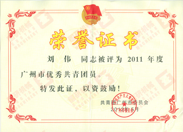 2012年6月,國研機械公司劉偉同志被共青團廣州市委員會(huì )評為“2011年度廣州市優(yōu)秀共青團員”。